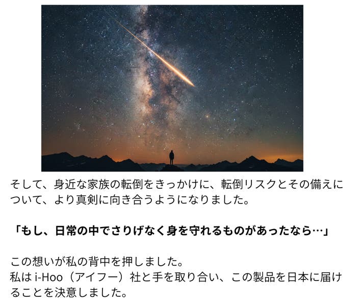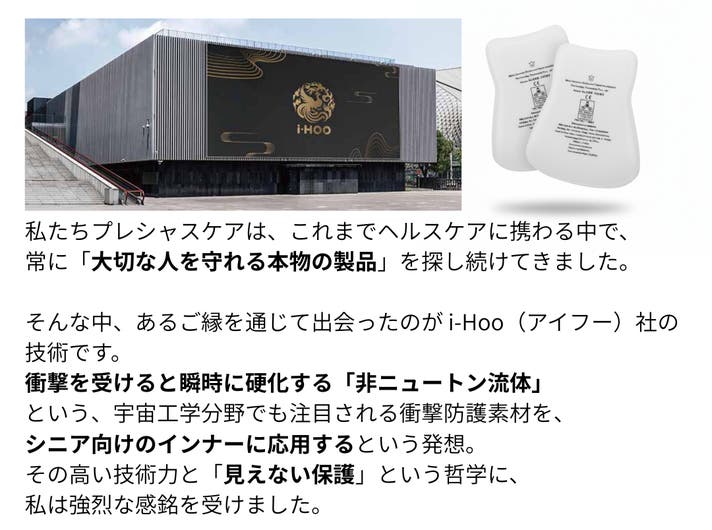 この度、貴重なご縁により巡りあった i-Hoo社の素材技術に感銘を受け、本プロジェクトを立ち上げました。代表自身の家族の転倒経験から「もっと早くこの製品を知っていれば」という切実な想いを抱き、日本での展開を決意。大切なご家族を想う皆様の気持ちに寄り添い、健やかな毎日を共に支えてまいります。