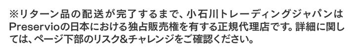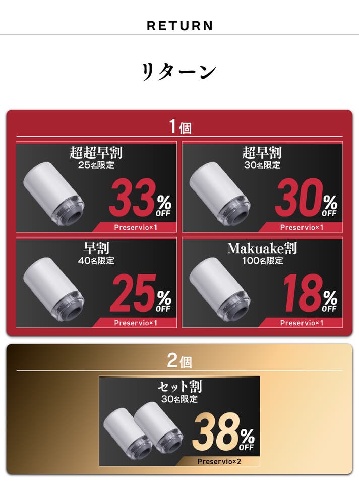 プロジェクトに関する情報 ・プロジェクトの属性:輸入商品 ・代理店によるサポート:製品保証1年間 ・プロジェクト実行者(国):日本 ・製品者(国):アメリカ ・製造者(国):中国 ※並行輸入品が発生する可能性があります。正規以外での個人輸入等は、完全に防ぐことができない場合がございます旨、予めご了承のほどお願いいたします。 ※リターン品の配送が完了するまで、小石川トレーディングジャパンはPreservioの日本における独占販売権を有する正規代理店です。並行輸入品が発生する可能性がございますが、並行輸入品には正規代理店による製品サポートを受けることができません。 また、正規代理店を通じて購入することで、日本国内での流通に必要な各種認証の取得や、関税の適切な処理が担保されます。 ※一部国内に類似商品が出回っている場合がございます。弊社では他社の類似品に関してのお問い合わせには対応できませんのでご了承ください。 ※使用感などに関しては、感じ方に個人差が予想される製品でございます。そのため、使用感等に関する返品・返金はお受けいたしかねます。 ※初期不良以外に関する返品・返金はお受けいたしかねます。 ※デザイン・カラー・素材などの仕様が一部変更になる可能性がございます。 ※モニター環境によって、画像の色が実物と異なって見える場合がございます。 ※応援購入の数が想定を上回った場合、製造工程上の都合等により出荷時期が遅れる場合がございます。 ※皆様から想定を上回る応援購入を頂き、量産体制を更に充実させることができた場合、一般販売価格が予定価格を下回る可能性がございます。 ※本プロジェクトはアンコールプロジェクト(*)の実施可能性があります。 (*)アンコールプロジェクトとは、実施したプロジェクトが好評だった場合において、当該プロジェクトが終了後に再び数週間から数ヶ月程度実施するプロジェクトを言います。 アンコールプロジェクト実施の場合、本プロジェクトとアンコールプロジェクトで同じ配送月を設定する可能性もございますが、本プロジェクトのサポーターを優先して配送いたします。 ※本文中に記載させていただいたスケジュールは、あくまでプロジェクト公開時点の予定です。応援購入の性質上、配送遅延のおそれがございます。原則として、配送遅延に伴う応援購入のキャンセルはできませんが、リターン配送予定月から3ヵ月を超えた場合には、希望者に限りキャンセルにて対応させていただきます。 【商品等の不具合による返品・交換】 原則として、サポーター都合によるキャンセル・返金は承っておりません。 (サポーター都合のキャンセル不可の例:サイズが合わない、誤注文、長期不在) ◾️対応条件: 商品の初期不良、またはお届けした商品がご注文内容と異なる場合、到着後14日以内にプロジェクトページの「実行者にメッセージ」よりご連絡ください。状況を確認の上、返金対応、または良品との交換対応をさせていただきます。 ◾️返金額: リターン金額(税込)の全額 ◾️返品送料/再送料: 実行者負担 【返品・交換をお受けできない商品】 ・サポーターの責任により破損、汚損が生じた商品 ・商品のタグ、付属品、パッケージ(箱、袋など)を紛失、破棄された商品 ・事前にご連絡をいただいていない商品 ・商品到着後、15日以上経過した商品 【交換をお受けできないケース】 ・限定品や同一商品の在庫がない場合など、代替品をご用意できない商品 以上の注意点につきましてあらかじめご理解とご了承いただいた上で応援購入くださいますよう、よろしくお願い申し上げます。 最後に、本製品を手に取った皆様に喜んでもらえるよう、チームメンバー一同心を込めて対応していきますので、 応援よろしくお願い致します。