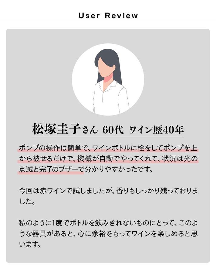 真空状態で開封を繰り返すと、揮発した味や香りの成分が飛んでしまい、従来のワインの味が弱まるのです。