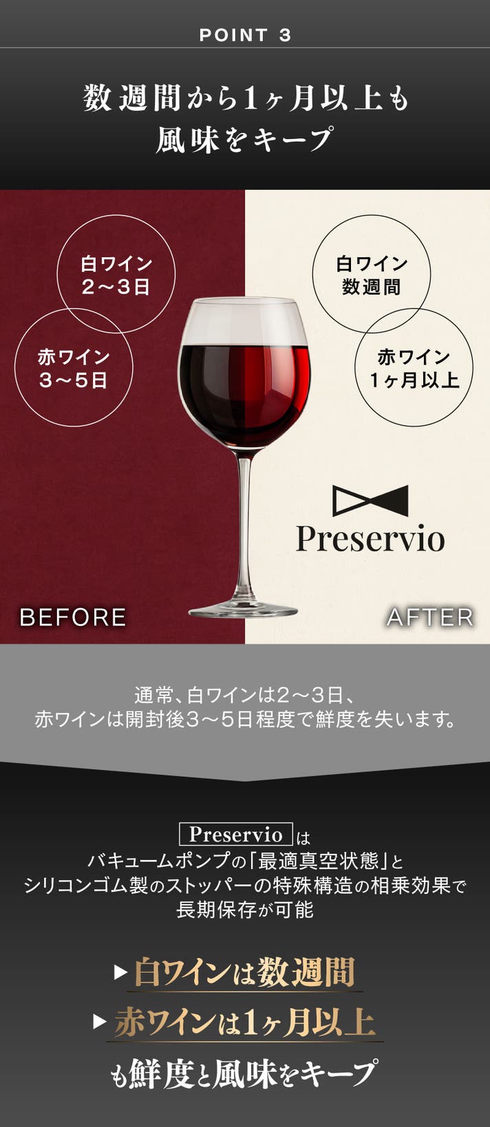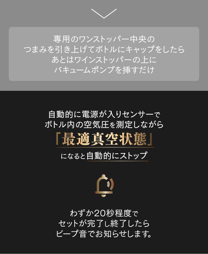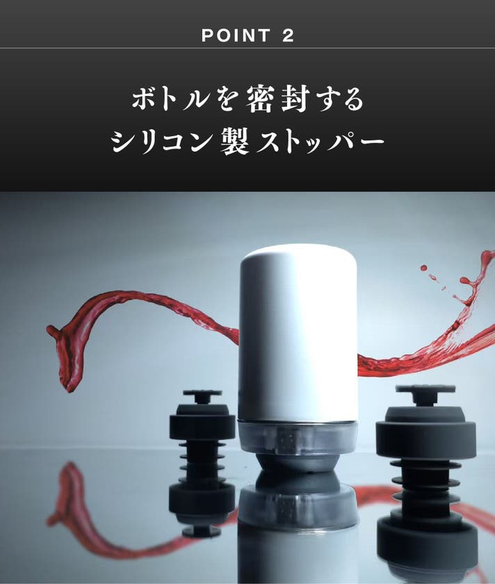 ワインに最適な真空状態を作り出し、白ワインなら数週間、赤ワインなら1ヶ月以上も美味しさと鮮度をキープ。