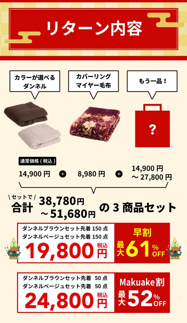 「Makuake(マクアケ)」は、実行者の想いを応援購入によって実現するアタラシイものやサービスのプラットフォームです。このページは、 プロダクトカテゴリの 「【最大61%OFF】寒さを乗り切る極暖寝具&便利な生活アイテム計3点の爆得福袋!」プロジェクト詳細ページです。