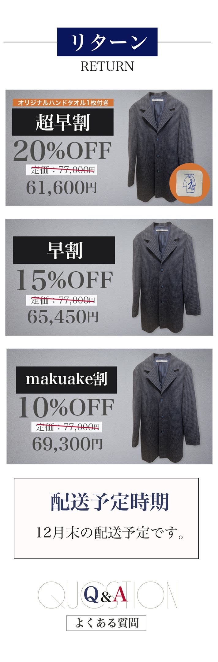 「Makuake(マクアケ)」は、実行者の想いを応援購入によって実現するアタラシイものやサービスのプラットフォームです。このページは、 ファッションカテゴリの 「軽さも暖かさも見た目の美しさも。プレミアフライングコートで快適な冬を」プロジェクト詳細ページです。