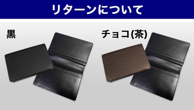 各リターン、名刺入れのお色味は黒とチョコ(表革茶色)の2種類からお好きな方をお選びいただけます。内側はどちらも黒色になります。リターンで、黒とチョコ(表革茶色)の2色の中から選べるように選択していただいております。