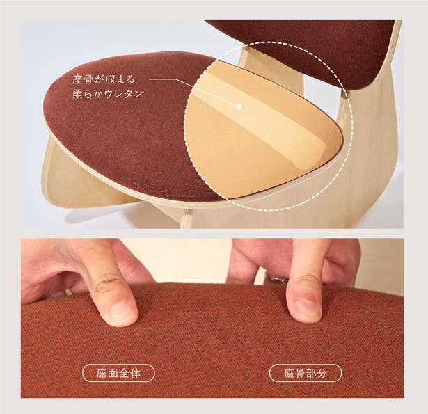 座面全体は程よい硬さのウレタンを使用しており、お尻全体をしっかりサポートします。座骨部分の圧力のみを柔らかいウレタンで吸収するため、長時間楽に座ることができます。