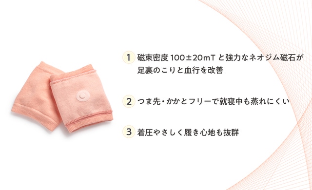 サポーターの中心に磁束密度100±20mTのネオジム磁石がついており、じんわりと足裏のこり及び血行を改善します。