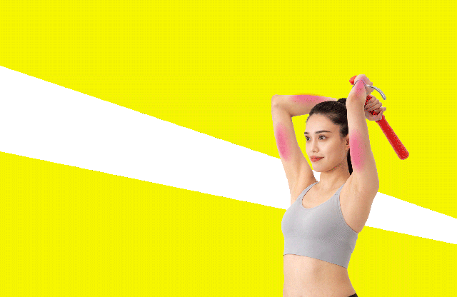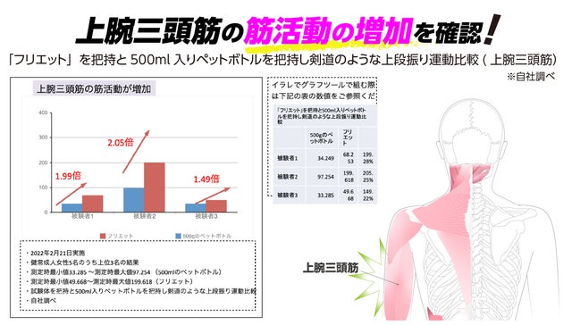 たるんだ二の腕の“ふりそで肉”の原因の1つには、二の腕の裏側にある上腕三頭筋が使えていないことにあります。腕を振り上げる素振りの動作は上腕三頭筋をエクササイズできるだけでなく、このフリエットにはインパクトウェイトとバネが内蔵されており、振るたびに振動が発生し筋肉を刺激するため、より効果的にエクササイズすることができます。また、素振りの動作だけでなく様々な振り方のプログラムを組んだので、前腕・ウエスト・胸筋・広背筋・肩周りといった全身を意識して楽しくエクササイズすることができます。腕を鍛えるためにダンベルやバーベルなど高負荷なトレーニングをされることが多いと思いますが、高負荷なトレーニングはケガのリスクも高くなります。このフリエットは適度な負荷で効果的にエクササイズができる全く新しいエクササイズグッズになります。