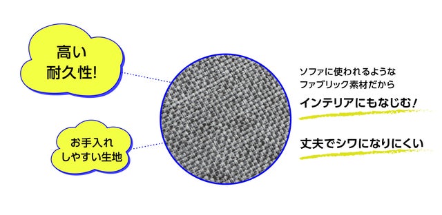 カバーは丈夫でシワにもなりにくく、外して洗濯も可能で衛生面も嬉しい。ソファに使われるような素材で、長く使用いただける仕様です。