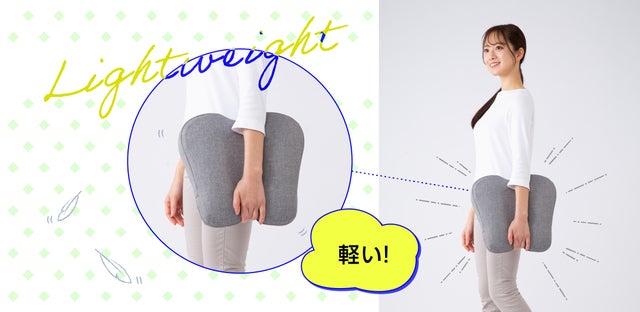 お尻に敷いても、背中にあてても使えるハイブリッドな仕様で、椅子やシチュエーションにあわせて使い方を選べます。