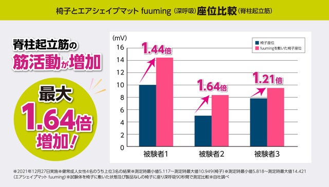「fuuming」の使用あり・無し、それぞれで椅子に座った時の姿勢を支える脊柱起立筋の筋活動量を比較しました。本品を使用して座った時の方が、最大約1.6倍、筋活動量がUPするのを確認しました。
