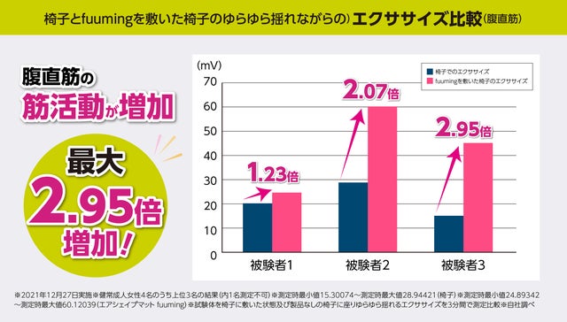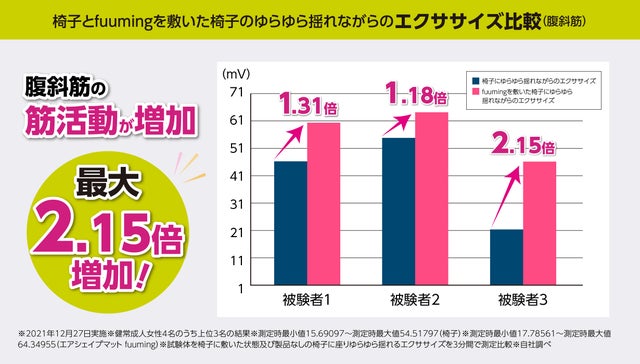 また、椅子の上で「fuuming」を使用あり・無し、それぞれで左右におしりステップでゆらゆら揺れた時の筋活動量を比較しました。