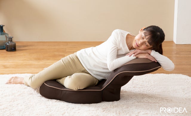 長く座っていることが多い現代社会では、座っているときの不良姿勢が、首や腰にも影響を与えることがあります。座っているときには体がゆがまないよう正しい姿勢を保持することが大切です。 この座椅子は 背もたれの大きなクッションと細かな3つのリクライニング機構によって、座っているときも背筋の伸びた正しい姿勢をサポートしてくれます。 まず、普通に座っていても快適にくつろげるだけでなく、背筋が伸びた適切な姿勢を保持できます。また、背もたれを抱っこするように抱えこんで座れば、姿勢を支える横隔膜を前からサポートしてくれます。さらに、背もたれを後ろに倒せば、胸部を開くようにストレッチすることもできます。 また、太もも部分をサポートするリクライニングが付属しているのでしているので、ふくらはぎ部分の筋肉を緩め、足の負担を軽減させるといったことも可能です。筋肉に負荷をかけず、背筋の伸びた正しい姿勢を保持してくれるので、肩や腰が気になる人には、とても有用だと思います。