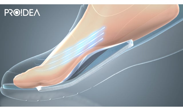 足裏の踏み込みに合わせて空気が動くエアサポートインソールのエアガイド機能で、足裏全体を自然と意識しながら使って歩くことができ、ぐらつきの少ない安定した重心移動に導きます。