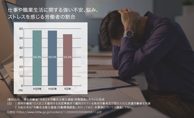 令和2(2020)年の調査で仕事や職業生活に関することで強い不安、悩み、ストレスを感じている労働者の割合は、54.2%であり依然として半数を超えていることが厚生労働省の調べで分かりました。さらにの内訳を見ると、「仕事の量・質」(56.7%)が最も多く、次いで「仕事の失敗、責任の発生等」(35.0%)、「対人関係(セクハラ・パワハラを含む。)」(27.0%)となっているのがわかりました(第 2-2 図)。