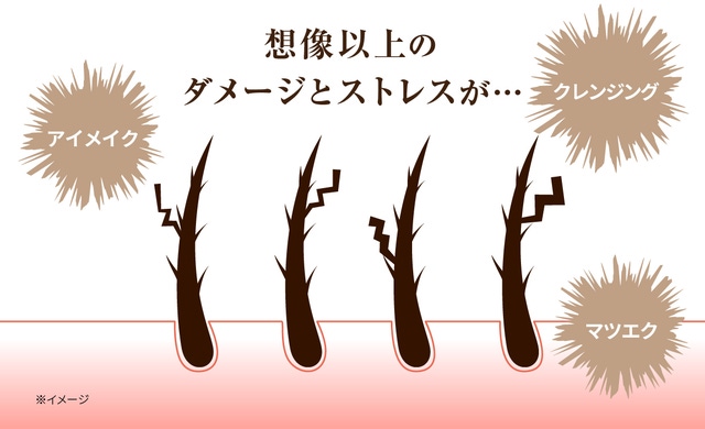 まつ毛は肌と同じようにタンパク質で構成されており、日頃の紫外線、乾燥、メイク等で目をこする癖などの外敵要因により、ダメージが蓄積していきます。また、長年のエクステや落としにくいマスカラの使用も、まつ毛を傷める原因になります。