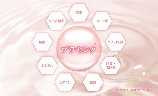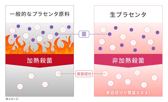 プラセンタには、美肌に欠かせないタンパク質(EGF、FGF、TGF)やお肌が本来持つ保湿成分アミノ酸が元来豊富に含まれています。しかし、熱に弱いため、殺菌の過程で熱が加わることが大きな課題でした。