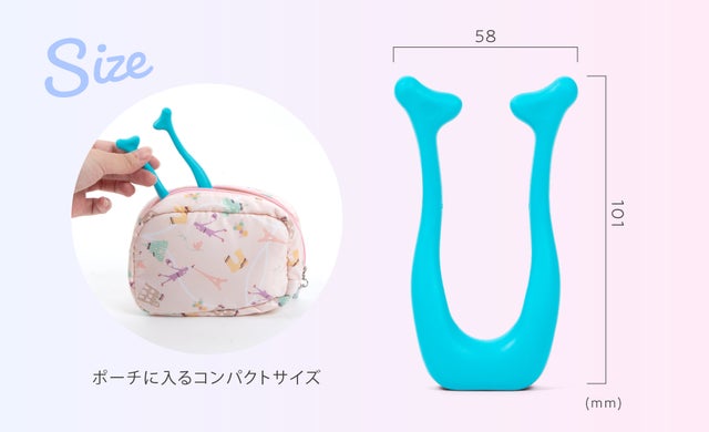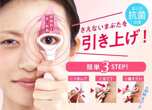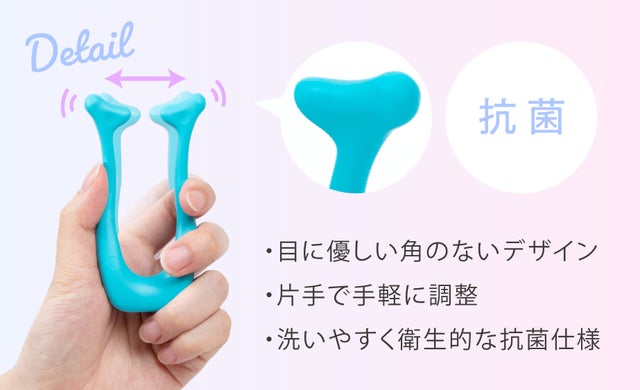 本体の操作はとても簡単。片手で握って目のサイズに合わせることができ、そこから引き上げるワンタッチ構造です。目に優しい角のないデザイン、下まぶたに当てて引き上げやすい形状を、何度も試作を重ねて設計しました。
