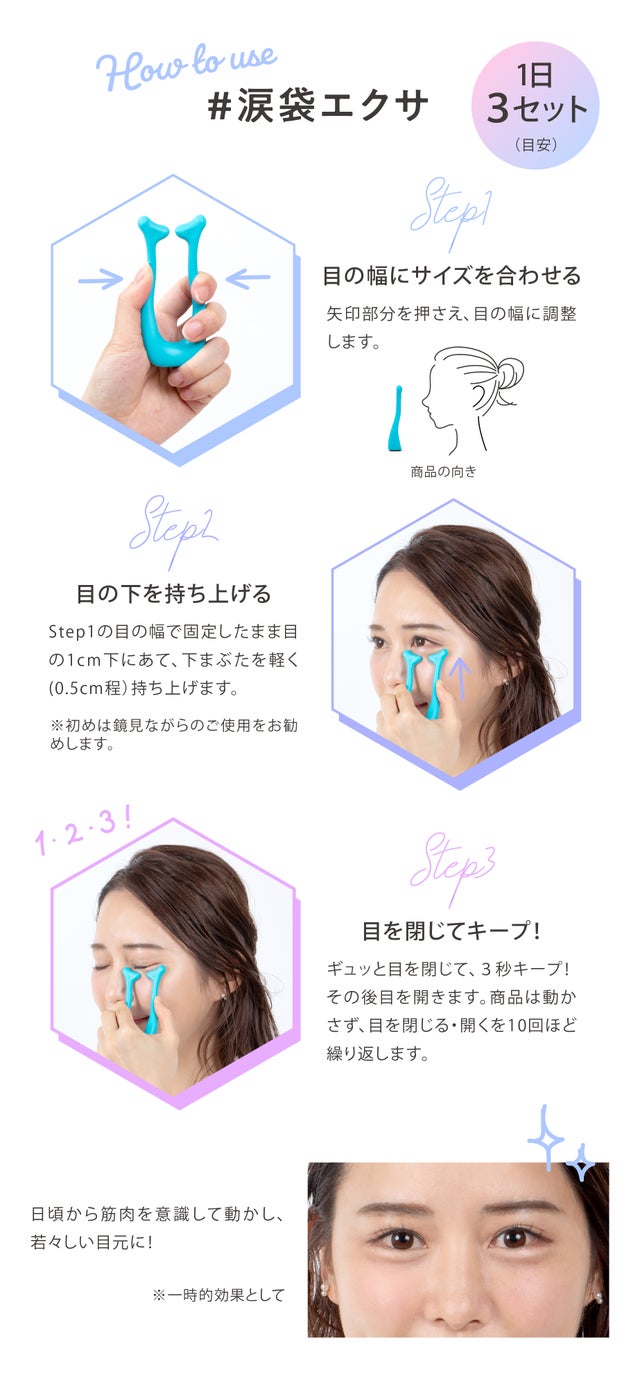 操作方法はとても簡単。目の幅にサイズを合わせて目の約1㎝下に当て、下まぶたを軽く持ち上げます。そしてギュッと目を閉じて3秒キープ。これを10回繰り返すだけです。手軽にタッチ法の涙袋エクササイズができます。