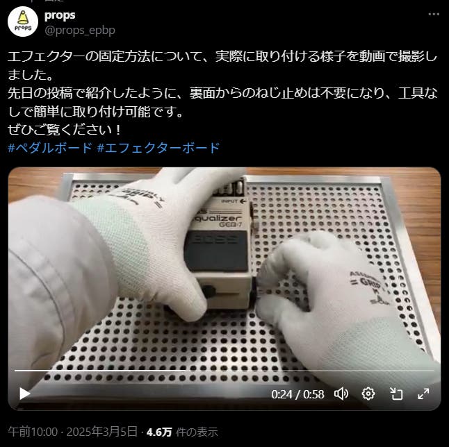 - 粘着テープを使わない、エフェクターにやさしい固定方式