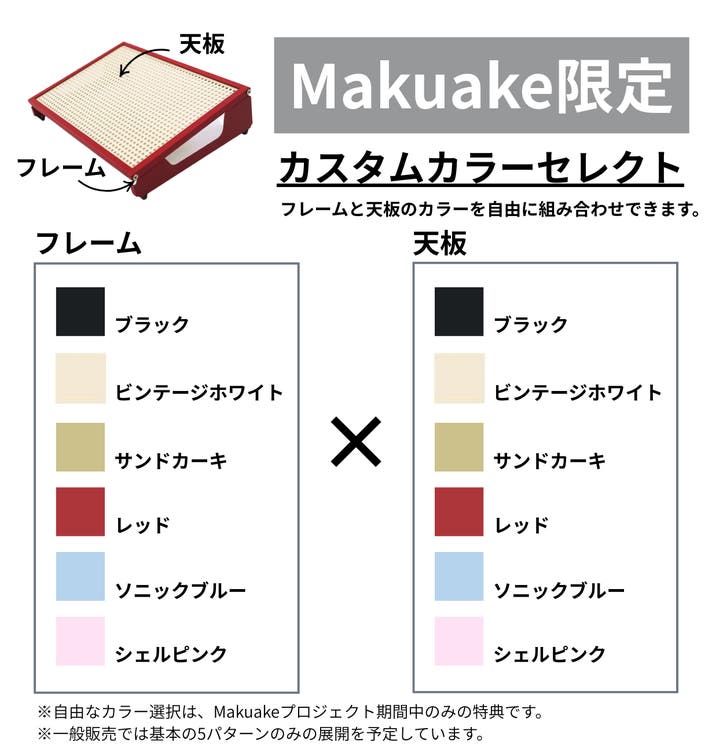 基本のカラーバリエーション(5パターン)に加え、Makuake限定で下記6色の中から、フレームカラーと天板カラーを自由に組み合わせてご注文いただけます。