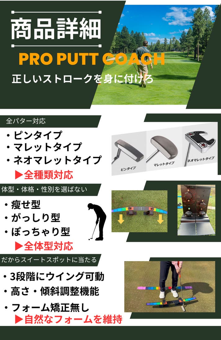 - 体型や骨格、パター形状に捉われない柔軟設計!自宅にて簡単パッティング技術向上!
