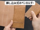 表側の8色、帯、ペンホルダー、内面のポケット部分はイタリア製タンニンなめし革の「マヤレザー」を使用しています。内面の肌色の革は国産のヌメ革「タンロー」を使用しています。
