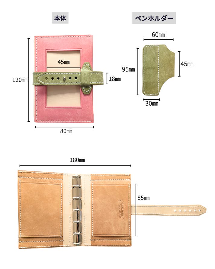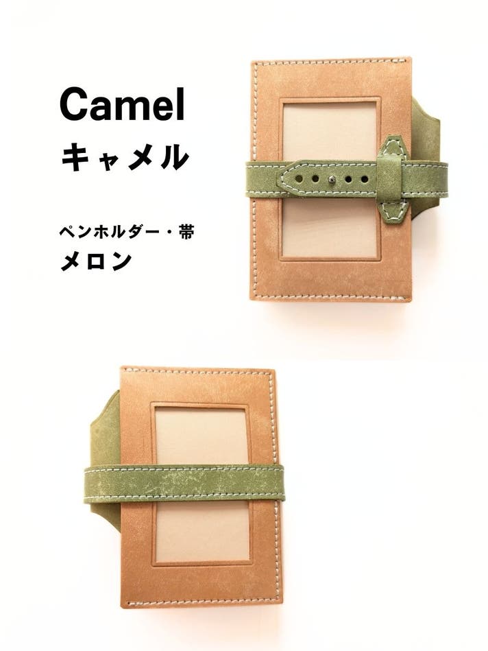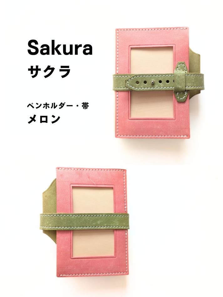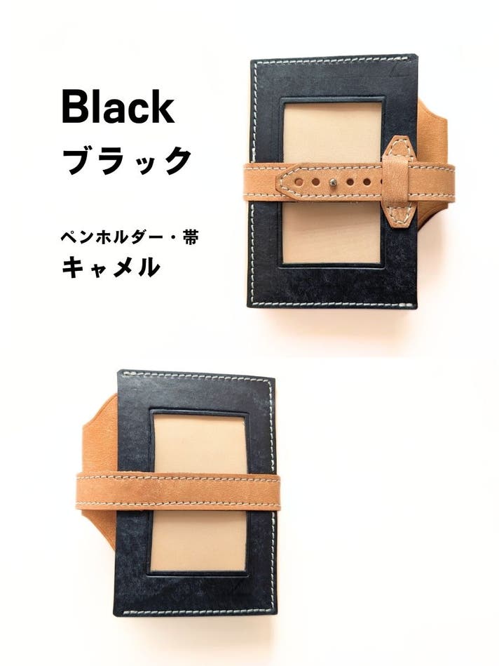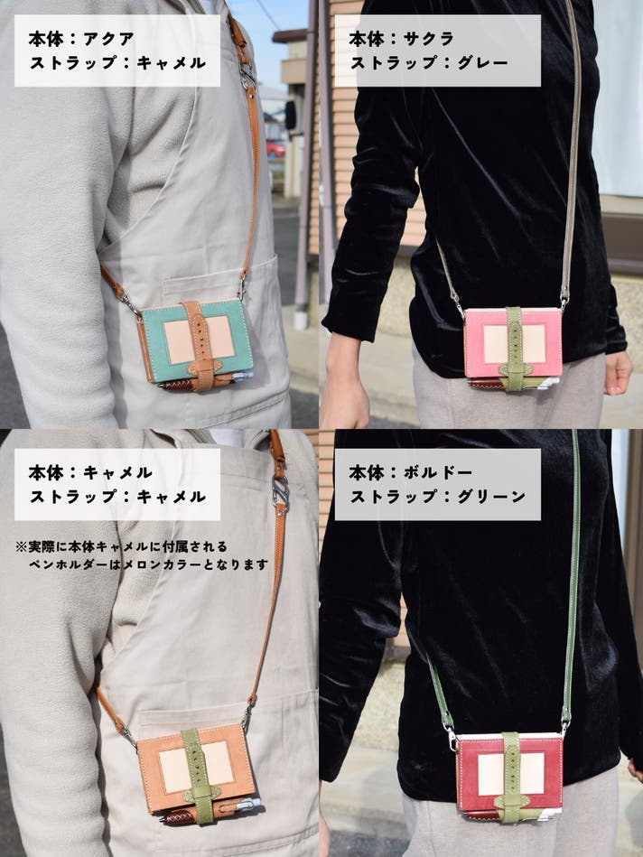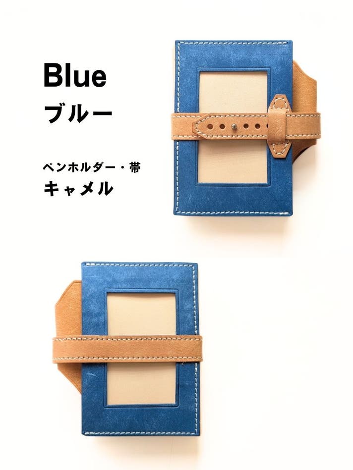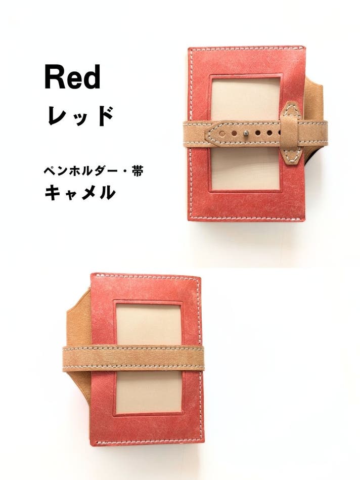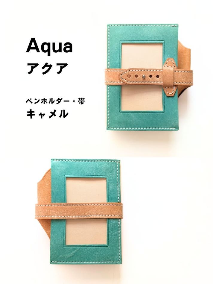 表面カラー8色(ブラック、キャメル、ブルー、レッド、サクラ、メロン、ボルドー、アクア)、帯、ペンホルダー、内面のポケット部分は、イタリアのレザー「マヤレザー」を使用