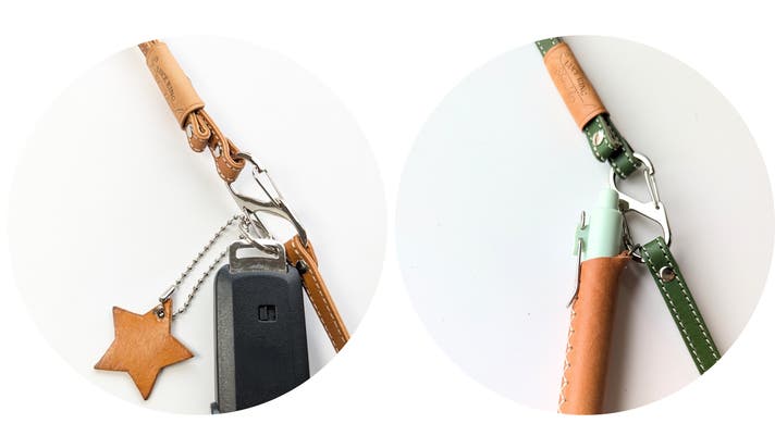 途中にはシルバーのS字カラビナを配置。鍵やLUCE Pen Fit Dカン付きなど、すぐ使いたい小物を取り付けるのに便利です。
