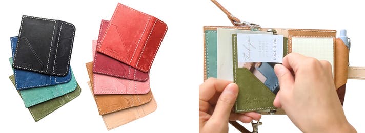 封筒みたいな可愛い形で、蓋の部分を本体に差し込める構造です。単体でも名刺入れやカードケースとして使っていただけます。