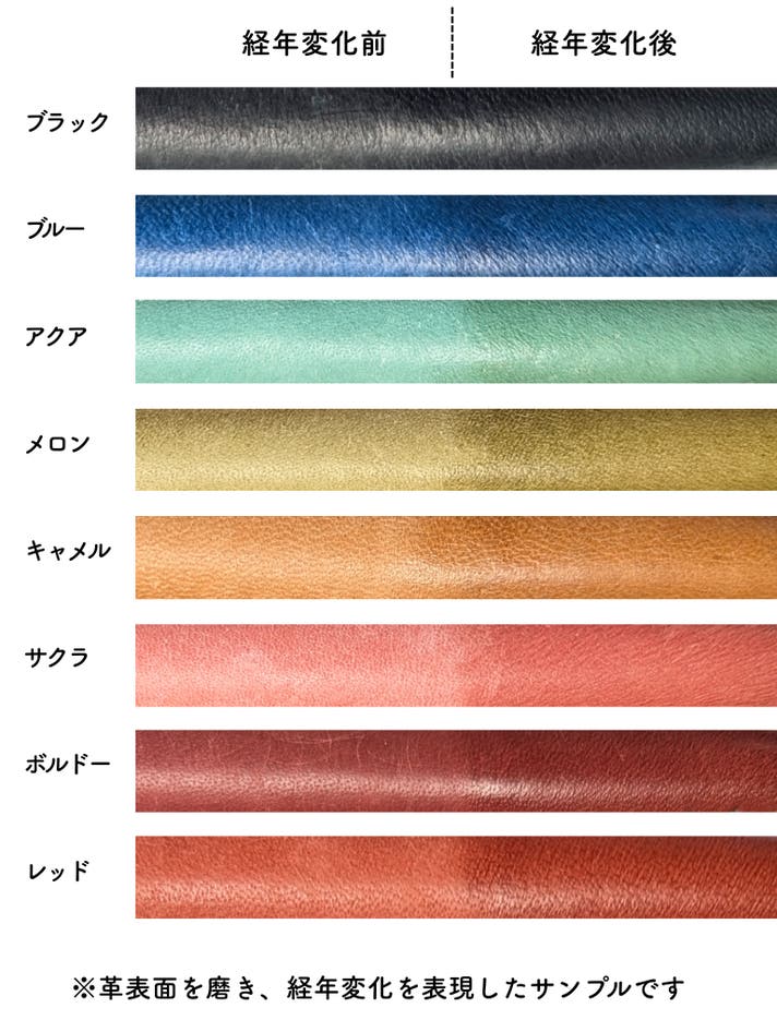 丈夫で長持ちし、革本来の風合いが特徴です。初めは薄いベージュですが、エイジングが早く、使い込むうちに綺麗な飴色になります。