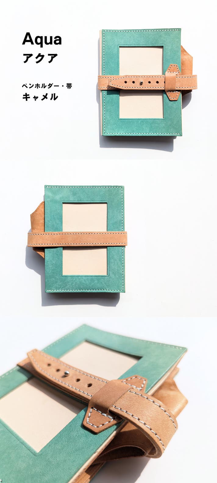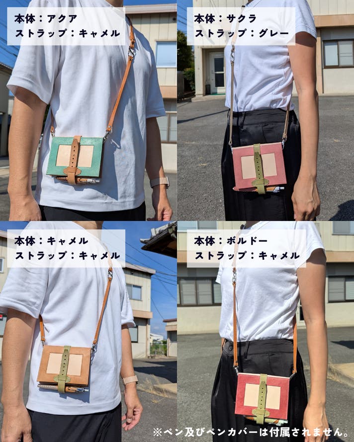 表面カラー8色(ブラック、キャメル、ブルー、レッド、サクラ、メロン、ボルドー、アクア)、帯、ペンホルダー、内面のポケット部分は、イタリアのレザー「マヤレザー」を使用