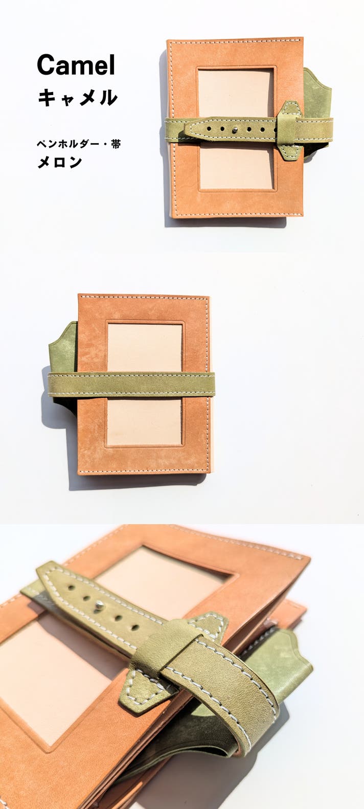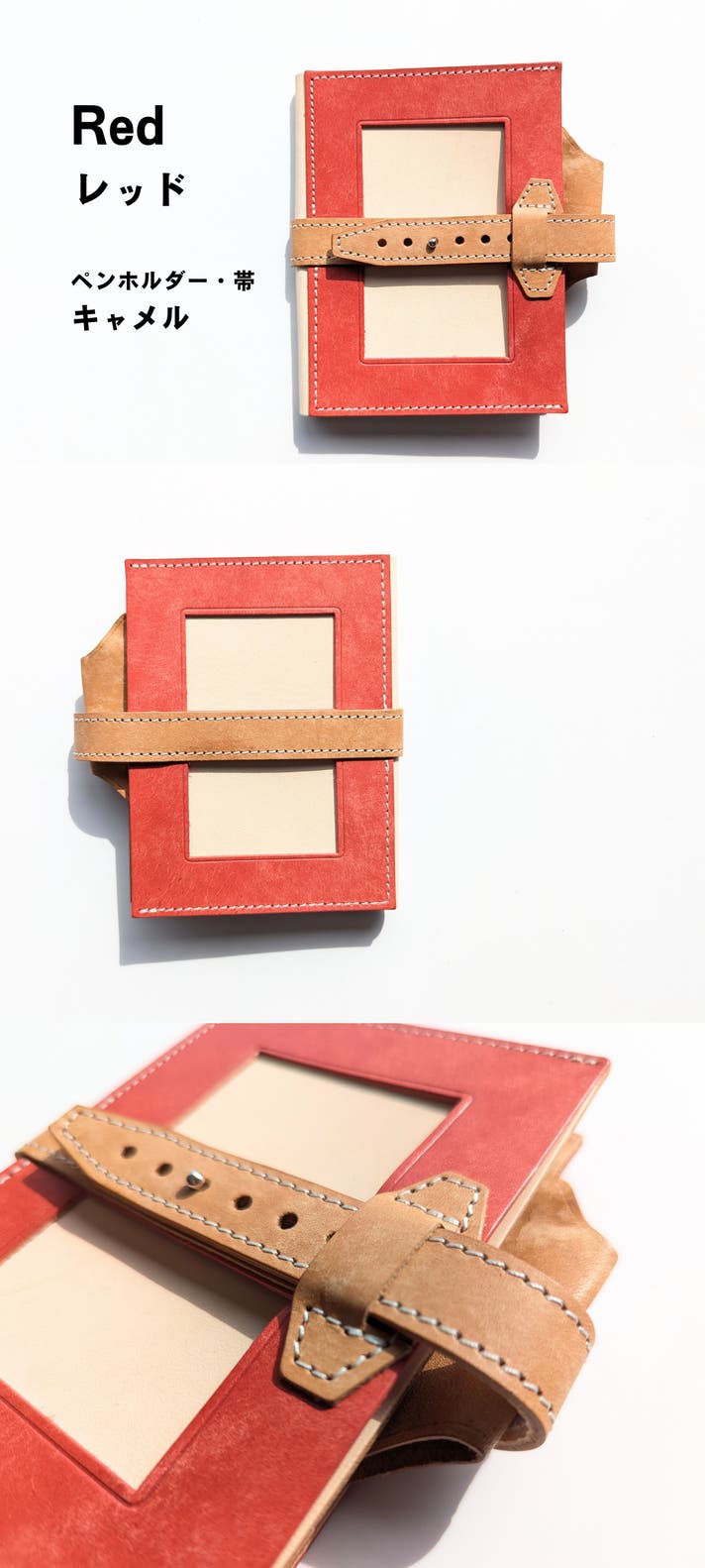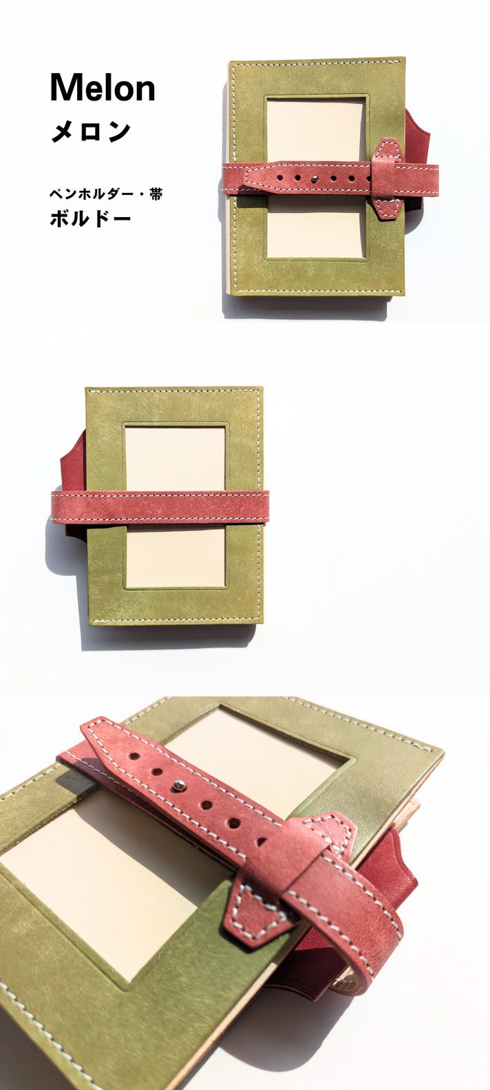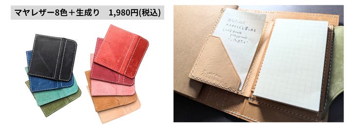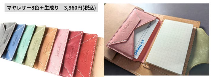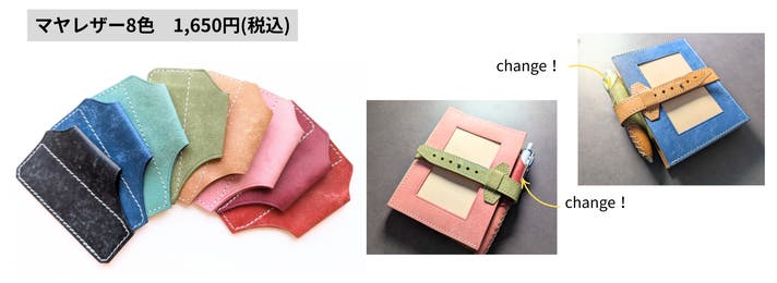 表面カラー8色、帯、ペンホルダー、内面のポケット部分は、イタリアのレザー「マヤレザー」を使用しています。内面のベージュの革は、国産のヌメ革を使用しました。