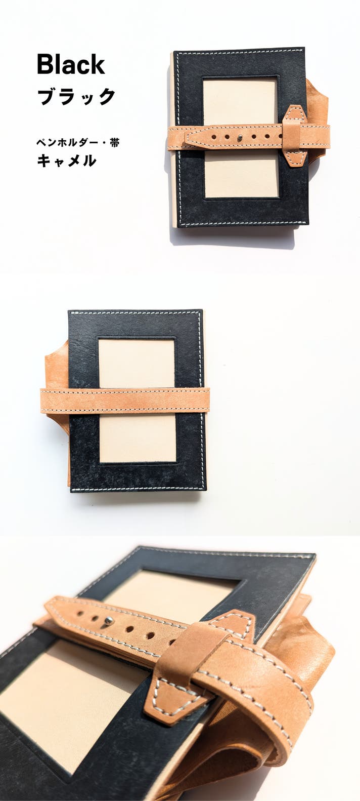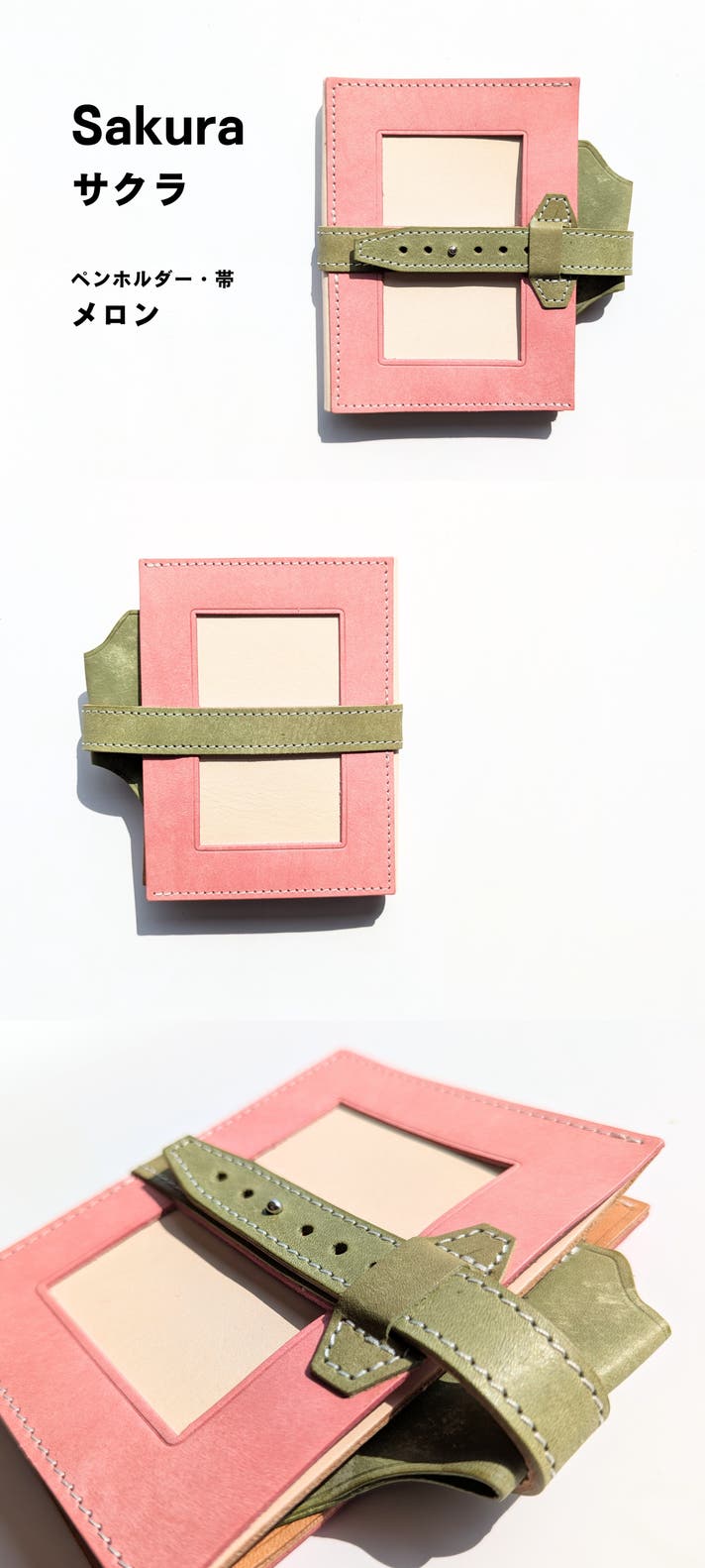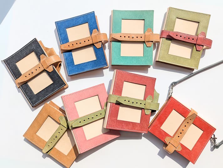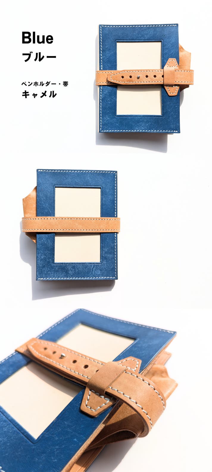 表面カラー8色、帯、ペンホルダー、内面のポケット部分は、イタリアのレザー「マヤレザー」を使用しています。内面のベージュの革は、国産のヌメ革を使用しました。