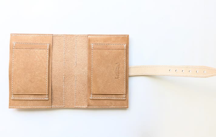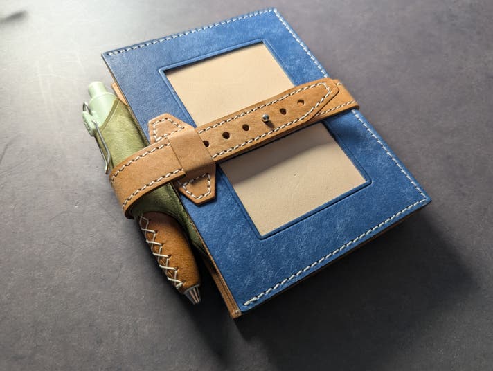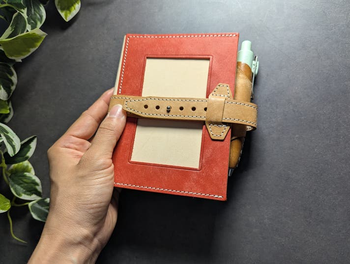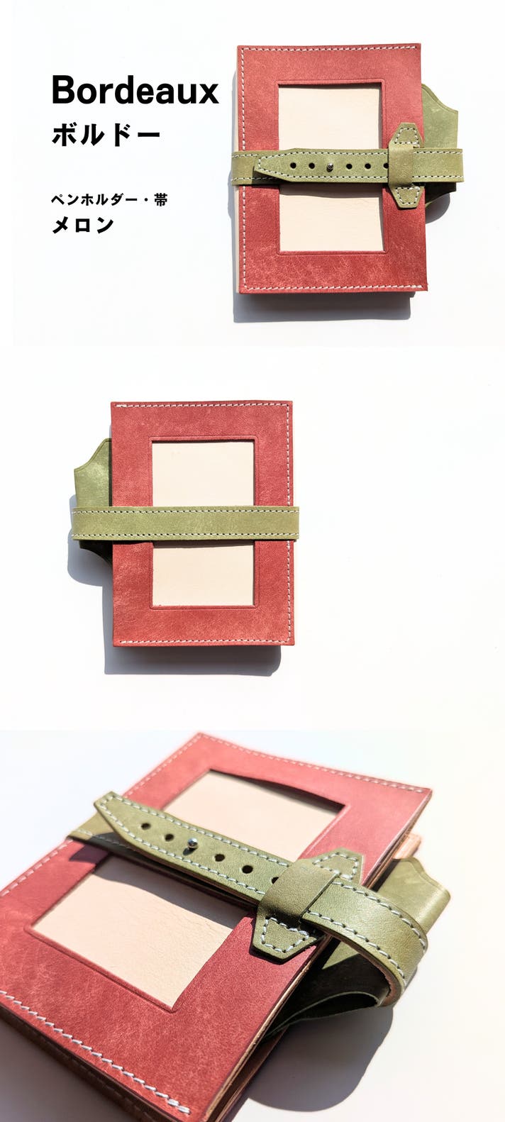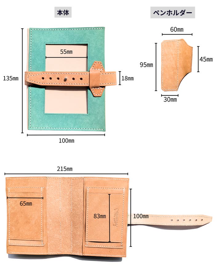 表面カラーと帯・ペンホルダーはイタリア製のマヤレザー、内面のベージュ色の革は、国産のヌメ革を使用しています。