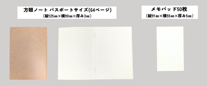 方眼ノート パスポートサイズ(B7) 、メモパッド50枚が付属されており、本体のポケットに差し込んで使えます。
