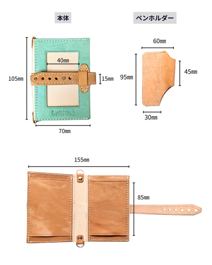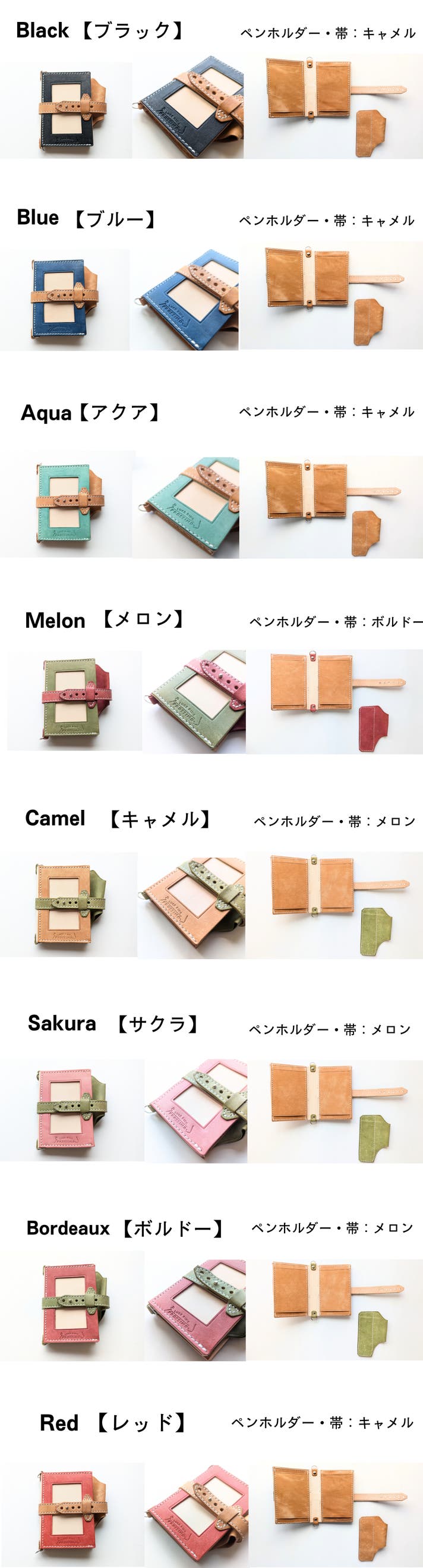 表面カラー8色(ブラック、キャメル、ブルー、レッド、サクラ、メロン、ボルドー、アクア)、帯、ペンホルダー、内面のポケット部分は、イタリアのレザー「マヤレザー」を使用