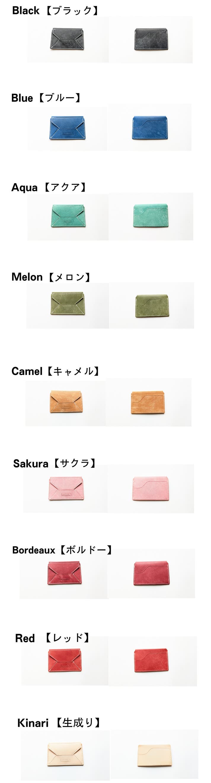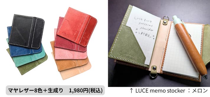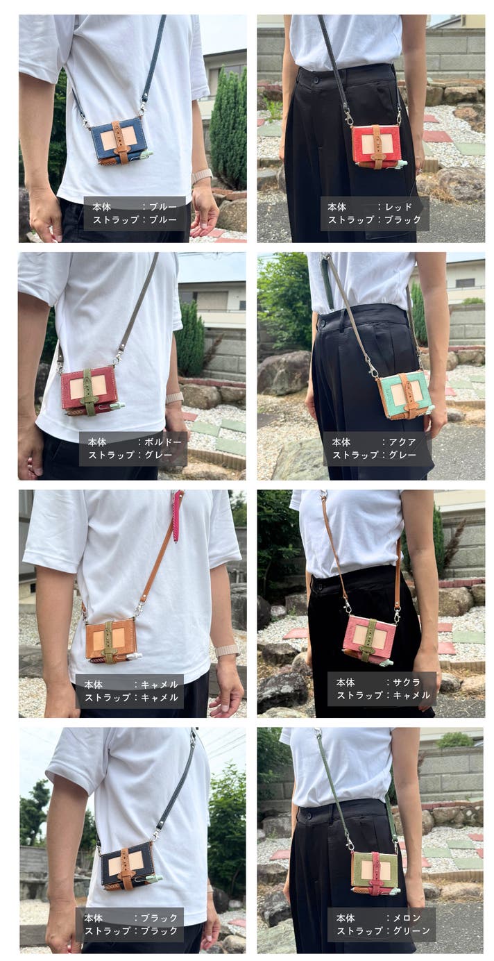 8色(ブラック、キャメル、ブルー、レッド、サクラ、メロン、ボルドー、アクア)は、イタリアのレザー「マヤレザー」を使用