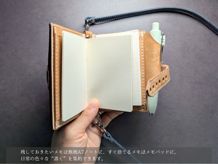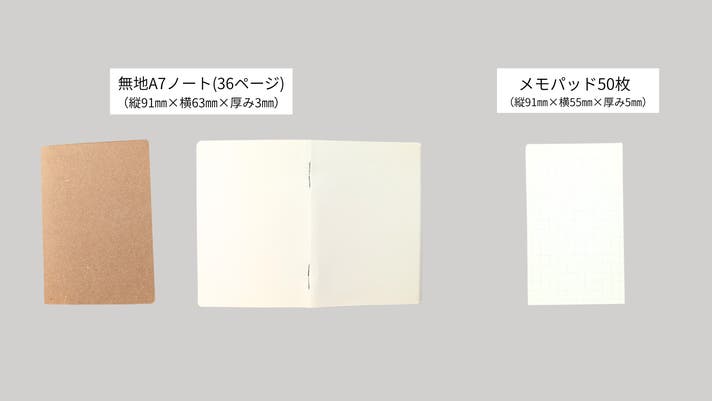 無地A7ノート1冊(36ページ)、メモパッド50枚が付属されており、本体のポケットに差し込んで使えます。
