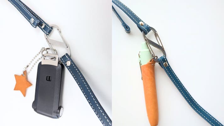 途中にはシルバーのS字カラビナを配置。鍵やLUCE Pen Fit Dカン付きなど、すぐ使いたい小物を取り付けるのに便利です。