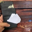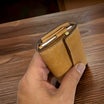 カード入れは以前にプロジェクトした2つ折り財布Trinityで開発したAQULIAオリジナルのロック型カードケースを採用しました。ロック型カードケースは決まった手順でしかカードを出すことが出来ず、収納するカードが1枚だけのスカスカな状態でもカードが落ちることがなく、また出し入れする際は片手でカードを扇状に開くことができるため使いたいカードを簡単に出すことができます。