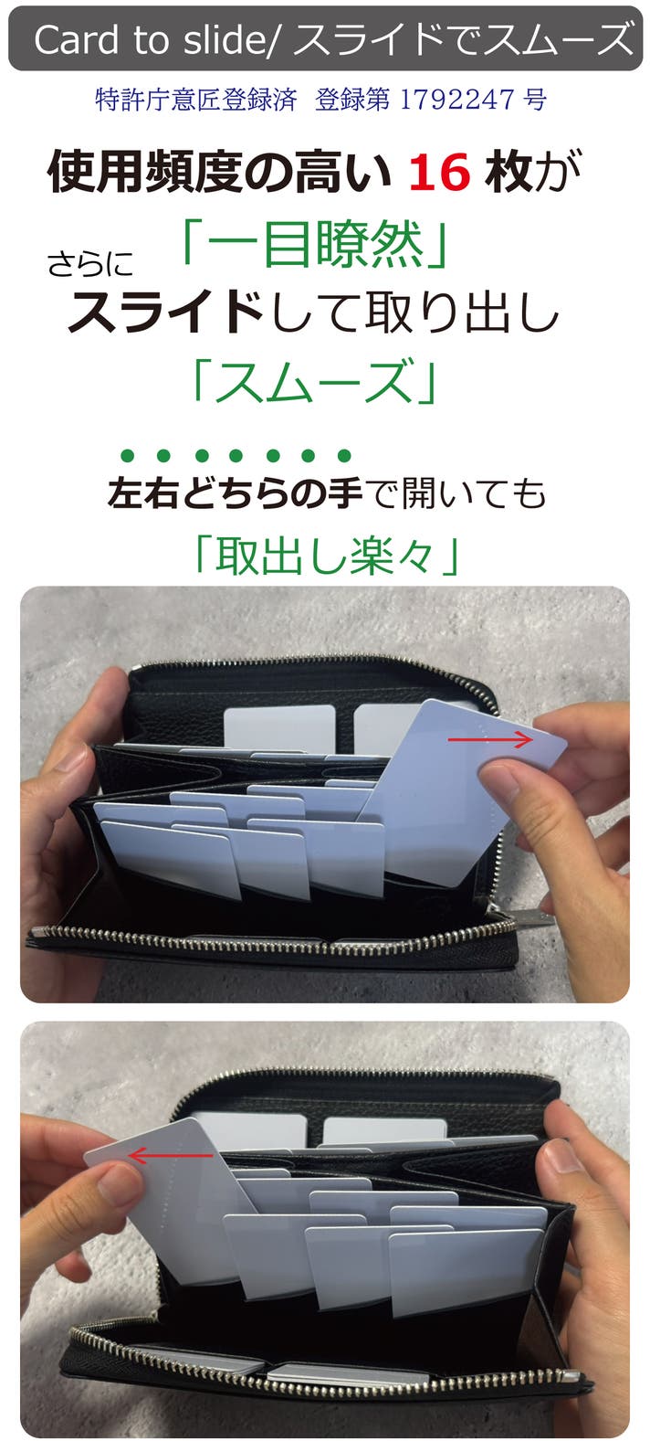 - ミニなのにカード「最大30枚」大きく開いて一目瞭然。意匠登録済仕様で「快適さ」も備えた長財布