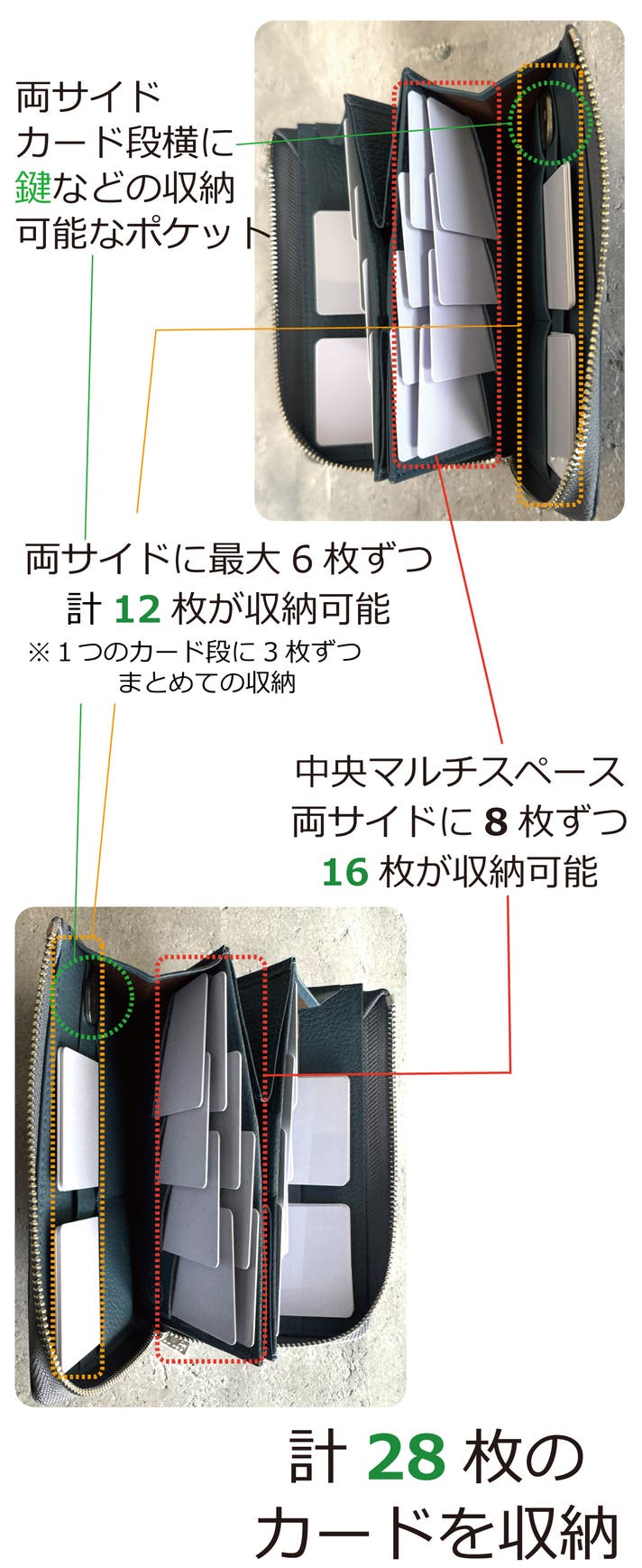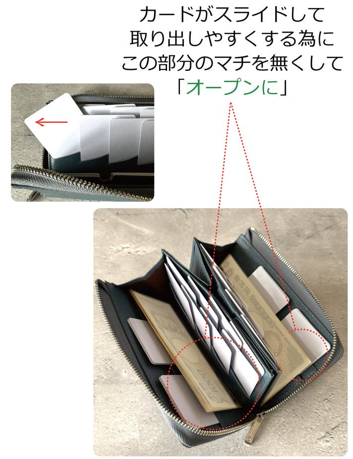 これにより財布自体が膨らみづらくなります。さらにファスナ―への負担軽減にもつながります。