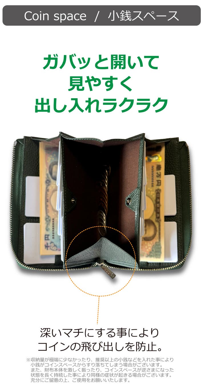 - さらに大きく開く小銭スペースが見やすく取り出しやすさ◎「サッ」と取り出せ、「一瞬」で支払い完了