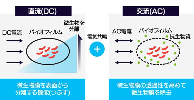直流(DC)は一方向に微細電流を持続的に加えるだけでなく、微細な加水分解を起こしてバイオフィルムを表面からつぶす機能をします。 交流(AC)は一定の周波数の振動を持続的に誘発してバイオフィルムの透過性を高め、除去する役割をします。
