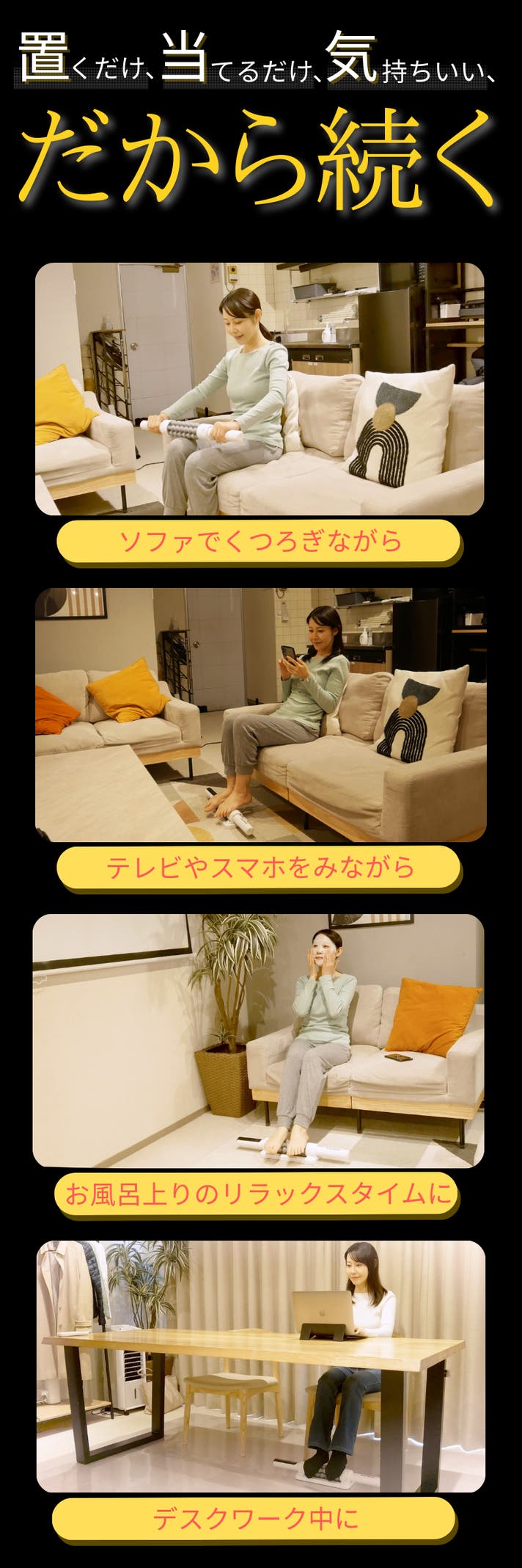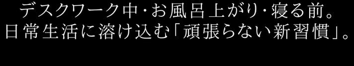 運動やストレッチのように時間を取って構えるのではなく、仕事の合間や、くつろぎの時間、1日の終わりのリラックスタイムなど、生活の流れの中で気軽に取り入れられること。