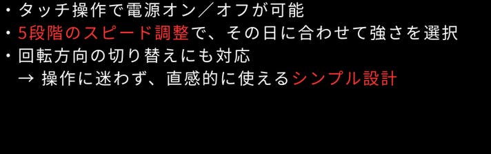 A: 操作はとてもシンプルです。タッチ式でスピード調整や回転切り替えが可能なため、機械が苦手な方でも直感的にお使いいただけます。足先での操作も可能です。