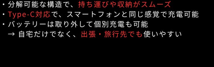 A: はい、分解式デザインで、持ち運び・収納・充電が簡単です。バッテリー部分を取り外して個別に充電するこもできます。