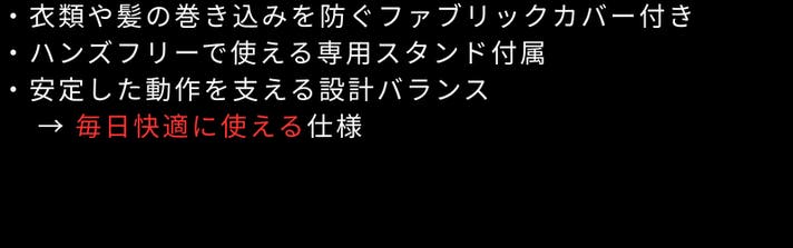 A: 衣類や髪の巻き込みを防ぐファブリックカバーを採用し、安全面にも配慮しています。