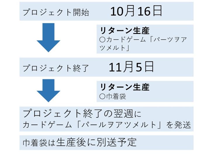 本文中に記載させていただいたスケジュールは、あくまでプロジェクト公開時点の予定です。 掲載している画像のカードゲーム、巾着袋は試作品です。 応援購入の性質上、配送遅延のおそれがございます。 原則として、配送遅延に伴う応援購入のキャンセルはできませんが、 リターン配送予定月から 1ヶ月 を超えた場合には、希望者に限りキャンセルにて対応させていただきます。 原則として、サポーター都合によるキャンセル・返金は承っておりません。 (サポーター都合のキャンセル不可の例:サイズが合わない、誤注文、長期不在) ◾️対応条件: 商品の初期不良、またはお届けした商品がご注文内容と異なる場合、到着後14日以内にプロジェクトページの「実行者にメッセージ」よりご連絡ください。状況を確認の上、良品との交換対応をさせていただきます。 ◾️交換送料: 実行者負担 【交換をお受けできない商品】 ・サポーターの責任により破損、汚損が生じた商品 ・商品のタグ、付属品、パッケージ(箱、袋など)を紛失、破棄された商品 ・事前にご連絡をいただいていない商品 ・商品到着後、15日以上経過した商品 ・限定品や同一商品の在庫がない場合など、代替品をご用意できない商品