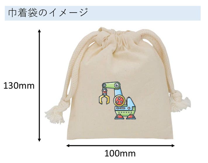 完成品の「ロボット」のイラストをプリントした巾着袋とのセットもご用意しました。