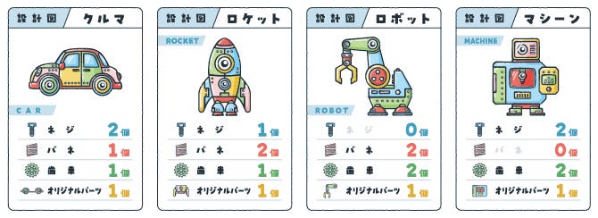 プレイヤーごとに、完成させる製品を「クルマ・ロケット・ロボット・マシーン」の中から決めましょう。